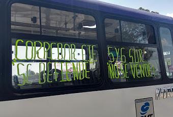 Ciudad de México. Camiones de transporte público concesionado de pasajeros de las rutas 14, 25, 27 y 112, con derroteros en los ejes 5 y 6 sur de la Ciudad de México, comenzaron una campaña de información y protesta en sus unidades para defenderse de quienes llaman oportunistas, que ante la próxima puesta en operación del nuevo corredor se quieren apropiar del mismo.Con pintas en sus unidades con la leyenda “CORREDOR EJE 5-6 SUR ¡SE DEFIENDE, NO SE VENDE!” a principios de la semana y “CORREDOR EJE 5-6 SUR PARA TRANSPORTISTAS, iNO PARA OPORTUNISTAS!”, aparecida hoy, los concesionarios manifiestan su inconformidad frente a la presión que existe en su contra para que vendan sus concesiones.
