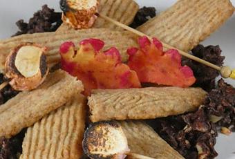 Colocamos en el centro del plato tablas de madera de galleta Graham y entre media ponemos las llamas de fuego de chocolate de modelar. Alrededor colocamos las rocas de chocolate y pinchamos en una brocheta la nube o marshmallow un poco quemada con un soplete de cocina.