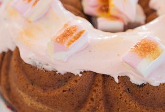 - Cubrir el bundt cake con las nubes derretidas. Adornar con mini nubes o nubes grandes cortadas en trozos.