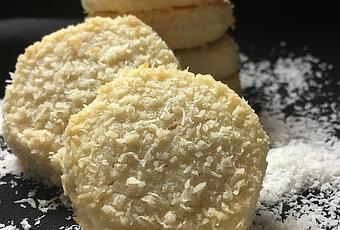 Batir la mantequilla con el azúcar glass, añadir el huevo ligeramente batido, poco a poco, la harina de almendra, los 50 g de coco y el pellizco de sal. Tamizamos la harina y la incorporamos a la mezcla anterior en forma de lluvia. Mezclamos bien todos los ingredientes hasta obtener una mezcla homogénea. Formamos un rulo o dos, envolvemos en papel vegetal y guardamos en frío durante dos horas.