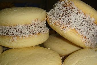 - 1 taza de harina- 1 taza de maicena- 1/2 taza de azúcar- polvo de hornear, una cucharada grande- 150 gr de mantequilla- 1 huevoRELLENO:- dulce de leche , 1/2 kg- coco ralladoPREPARACIÓN:Mezclar todos los ingredientes, hasta que logremos una masa suave y que no se pegue a las manos.Estiramos con palote, no muy fina.Luego cortamos circulos o discos, podemos hacerlo con cortapastas o con alguna copita de vidrio.Se lleva a horno precalentado, por unos 8 minutos, no tenemos que dejar dorar, simplemente cocinar.Unimos con abundante dulce de leche,para que sobresalga en los bordes y luego los hacemos rodar por el coco rallado.Podemos hacer el doble de la medida y guardar en un frasco de vidrio que cierre hermeticamente, ya que tienen larga duración, así podremos comerlo no solo el día que los hacemos, sino que también podemos saborearlos días después.Fuente: semujer