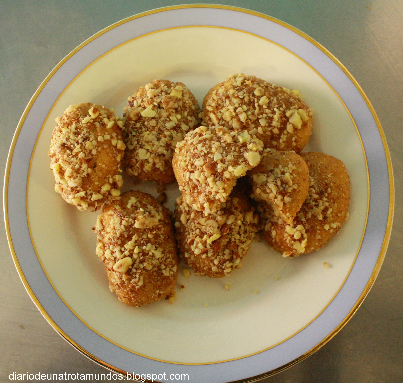 7. Espolvorear las nueces picadas/molidas sobre las galletitas aun calientes por el almibar (esto ayuda a que se adhieran).
