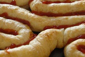 Mientras he preparado el hojaldre. He cortado la lamina de hojaldre en 5 tiras de 5x30 cm. He distribuido a lo largo de cada tira el relleno de pollo y champiñones y las he ido cerrando juntando los extremos y pellizcándolos para sellarlos hasta formas un canelon de cada tira. He ido colocando los canelones de hojaldre en una placa de horno formando un intestino, juntando y sellando el extremo de uno con el extremo del siguiente. Lo he horneado con ventilador y calor abajo a 200ºC durante 15-18 minutos (hasta que el hojaldre se ha hecho y ha empezado a tomar un poco de color, no tiene que dorarse). Lo he retirado del horno y lo he dejado reposar 5 minutos. Le he distribuido el ketchup por las juntas....