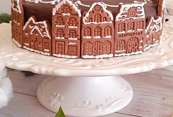 Os presento esta versión navideña de la Sachertorte, amurallada de galletas de casitas europeas de cacao, especiadas con jengibre y chocolate. Están decoradas con glasa real, que también acompañamos con el copo de nieve y florituras en la cobertura. Está rellena con mermelada en su interior y queda una miga aireada con el dulzor justo. El sabor a chocolate es delicioso y la cobertura le da ese plus para que sea perfecta para chocolovers.