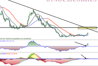 El aspecto técnico ha cambiado mucho, tenemos al MACD por encima de su línea cero, por tanto según este indicador habríamos entrado en tendencia alcista (¿?), y como consecuencia de su buena evolución de los dos últimos meses, Sacyr Vallermoso está evolucionando mejor que el IBEX 35.