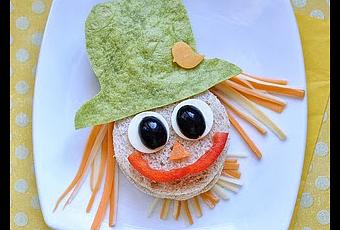 8 . Usé un pequeño cortador de galletas de birdie y corté un poco de forma birdie de una rebanada de queso cheddar . Se podría intentar esto con un cuchillo , también. Poner el birdie en el sombrero del espantapájaros.