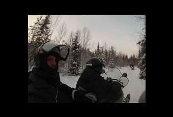 Nos juntaron de nuevo y cada uno se montó en su moto, regresamos por donde habíamos venido, pero antes de llagar al punto de partida, nos desviamos hacia la granja de huskies. Dejamos las motos aparcadas y entramos en la granja, había una gran cantidad de huskies, que guapos!!! Nos dejaron tocar y jugar con algunos de ellos. Estábamos encantados, que animales tan fantásticos, y más cuando nos acompañaron a los trineos. Nos montamos toda la familia junta de mas pequeño a más grande, acompañado por el guía que iba a transportarnos medio kilómetro por un circuito de nieve. Se nos hizo corto, que manera de correr los huskies, nos encanto.
