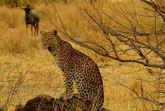 Las primeras luces del alba sorprendieron al leopardo en plena tarea de observación. En esos momentos el ñu miraba en nuestra dirección, aunque seguro que sus pupilas enfocaban al felino. Nosotros debíamos ser una imagen borrosa en segundo plano, no eramos su principal preocupación.