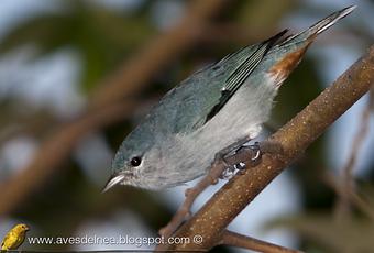 La cabeza es del mismo color, tiene la corona gris-celeste, el dorso es oliváceo, el vientre es blanco ocráceo y carece del subcaudal rufo del macho. Durante la mañana volví a observar a otra bandada mixta en otro sector y volví a fotografiara una hembra.