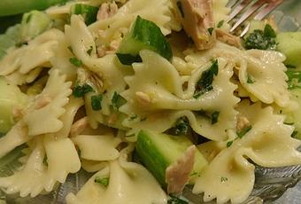 2.In a large bowl, put the cooled pasta; add the cucumber, the tuna, the cilantro, the lemon zest, lemon juice and olive oil. Season with salt and pepper. Toss well all these ingredients. Keep Chilled until serving time.