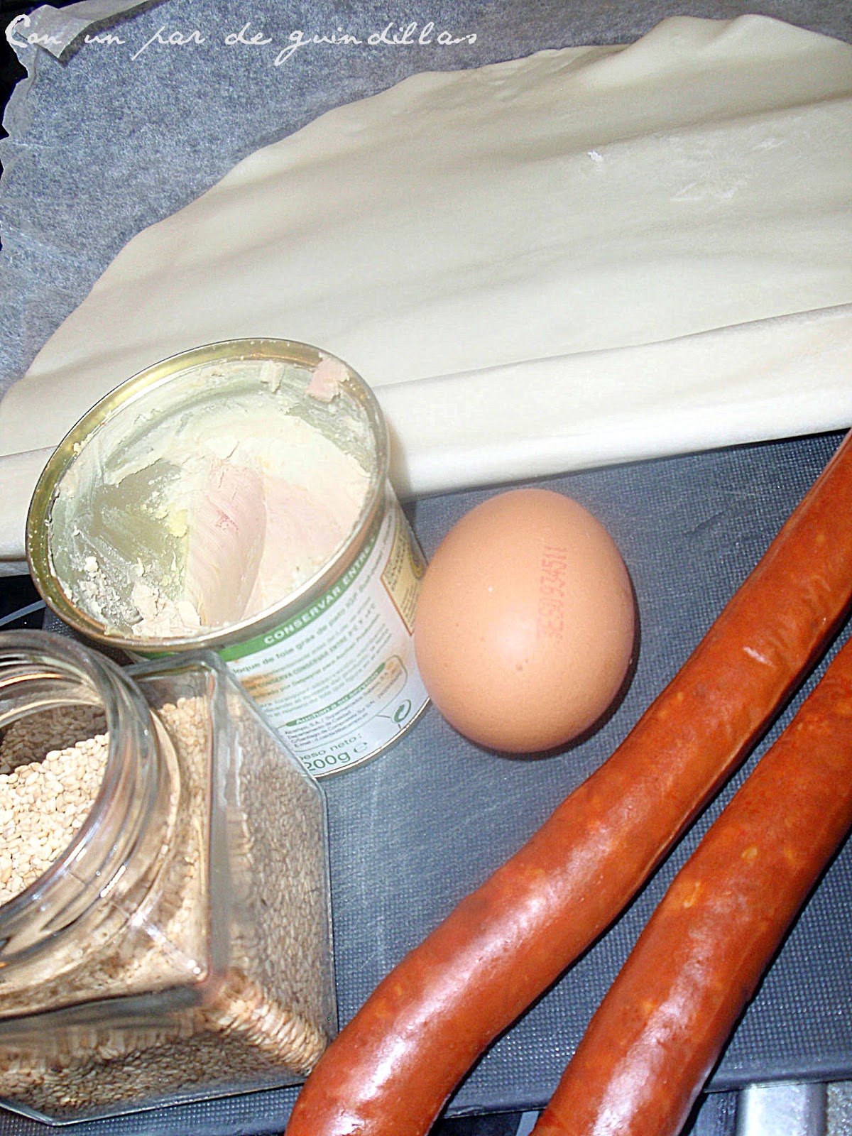 - El relleno de vuestra elección (estos llevan paté y chistorra. Se pueden hacer de anchoas, queso, sobrasada, jamón y queso…).