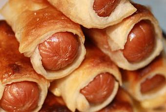 Hacemos cuadraditos de hojaldre y en unos ponemos salchichas, en otros ponemos jamón serrano y en otros trocitos de foie. Los sellamos con un poco de agua pegando ambos extremos del hojaldre. En los que hemos puesto jamón echamos unas virutas del que hemos hecho crujiente por encima y en los que hemos puesto foie pegamos una pipa.