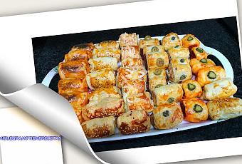 Hoy para una merienda en casa de unos familiares he querido elaborar algo salado. Unos saladitos de hojaldre muy fáciles de elaborar.INGREDIENTES:Cuatro masas de hojaldre refrigerada rectangularSobrasada2 latas de patéSalchichas de Frankfurt tipo CóctelLonchas de jamón yorkQueso en lonchasQueso para gratinarPaté de atúnAlcaparrasPepinillosOlivas rellanasChistorraDátiles con bacón Semillas de sésamo o ajonjolí, pimienta negra, orégano, Un huevo batidoELABORACIÓN:Precalentaremos el horno a 200ºC. Estiramos la masa de hojaldre y dividimos en cuatro partes igualPara elaborar los de jamón y queso, cortamos el jamón y el queso en tiras y hacemos un par de capas. Repartimos las salchichas de Frankfurt unas cuatro, las ponemos encima de la masa. Repartiremos un poco de paté y hacemos lo mismo con la sobrasada y el paté de atún, la chistorra, y los dátiles con bacón. Untaremos con huevo los rollos y partimos en trozos, los vamos poniendo en una bandeja de horno, con el cierre hacia abajo. A los de sobrasada yo he puesto encima una alcaparra, de jamón y queso queso rallado, a los de paté trozo de aceituna, chistorra pimienta negra, Frankfurt sésamo, bacón y dátiles orégano, pate de atún trozo de pepinillo.Introduciremos en el horno a 180º durante 20 minutos o hasta que veamos que están dorados.