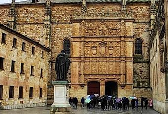 Recomendable extasiarse con la increíble fachada de la Universidad, considerada la máxima expresión del estilo Plateresco Español, esa que admira desde su estatua Fray Luis de León, quien sin duda no pierde de vista la figura de la rana, no sea que vaya a saltar. Buscar la rana es una tradición para quien contempla por primera vez esta impecable portada plateresca, y para quien la vuelve a contemplar, antes de adentrarse por estas edificaciones únicas y descubrir toda su belleza.