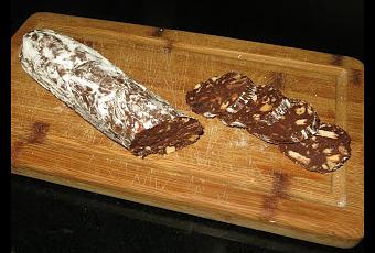 Mezclamos todo y tapamos con papel film. Metemos a la nevera durante una hora para que endurezca la mezcla. Luego lo echamos en un papel film y le damos forma de salchichón.