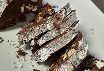 Colocar en un papel transparente y hacer un salami apretando bien, llevar a la nevera para que endurezca
