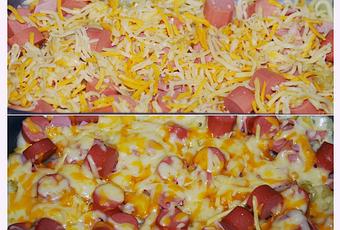 En un recipiente que pueda ir al horno ponemos una base de queso en lonchas, encima colocamos las patatas fritas y escurridas del aceite, luego ponemos las salchichas y el jamón. Por último espolvoreamos con el queso rallado (use 4 quesos pero sirve cualquiera)Metemos en el horno precalentado a 200º hasta que el queso este fundido. Servimos inmediatamente porque se enfría pronto.