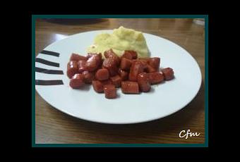 Y ya están listas nuestras salchichas con un aderezo diferente que le da un delicioso toque de sabor...Servimos con bien de salsita y acompañadas de puré de patatas...Que aproveche...