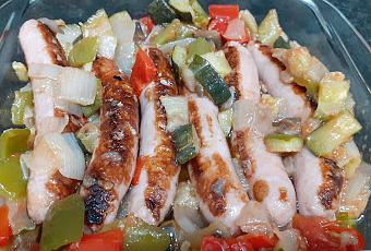 20 Salchichas de pollo1 Cebolla grande1 Pimiento Rojo1 Pimiento Verde1 Calabacín1 Berenjena400 gr. Salsa de Tomate fritoAceite de OlivaSal1 pizca de AzúcarELABORACIÓN.En una sartén grande añadiremos aceite de oliva y cuando esté caliente ponemos la berenjena. Rehogamos y escurrimos la berenjena para que suelte el aceite sobrante. Reservamos.Ponemos en la sartén la cebolla y sofreímos durante unos 2 minutos. Añadimos el pimiento rojo y el verde. Sofreímos todo durante unos 5 minutos, removiendo para que no se quemen las verduras.A continuación añadiremos el calabacín y rehogamos unos 3 minutos, removiendo y después añadiremos la berenjena bien escurrida. Salamos las verduras.Ponemos un poco de azúcar en la salsa de tomate y añadimos la salsa a las verduras procurando que quede todo bien mezclado. Bajaremos el fuego y coceremos unos 4 minutos.Pincharemos con un palillo las salchichas y las freiremos en otra sartén con aceite de oliva. Taparemos la sartén para que no nos salpique y las coceremos por los dos lados. No tienen que quedar demasiado doradas.Añadiremos las salchichas a la salsa sanfaina junto con el jugo que hayan soltado las salchichas al freír. Pondremos un poco de agua para que la salsa no quede tan espesa y no se pegue en el fondo de la cazuela y coceremos con el fuego bajo unos 4 minutos más.