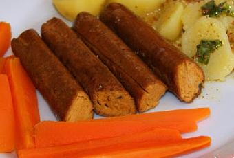 Salchichas de tofu con patatas y zanahorias y un aliño de motaza y albahaca.