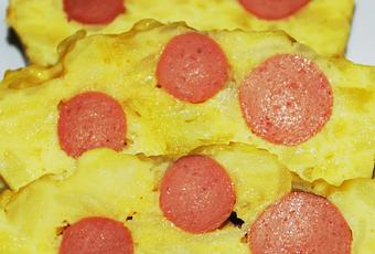 Engrasamos un molde para el horno (el que yo utilicé era de silicona) y pondremos una primera capa de la mezcla de huevos y patatas. Después dos salchichas (o más hasta cubrir lo largo del molde). Otra capa del preparado de tortilla. Salchicha/s. Y terminaremos con el resto de la mezcla de huevo y patata.