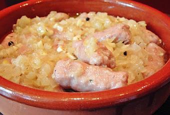 PREPARACIÓN:Poner aceite en una sartén donde pondremos a pochar la cebolla bien cortadita junto con la hoja de laurel, los granos de pimienta, el ajo y un poco de sal gorda, lo que ayudará al pochado.Cuando empiece la cebolla a volverse transparente agregamos las salchichas cortadas a la mitad y dejamos cocinar unos 5 minutos removiendo de vez en cuando para que se haga por todos los lados, en ese momento agregamos el vino blanco y las hierbas provenzales y dejamos cocinar otros 10 minutos para que el vino se vaya evaporando.