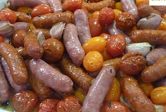 Lavamos los tomates y los colocamos en una bandeja de horno. Cortamos las salchichas por la mitad y las colocamos por encima de los tomates, entre las salchichas vamos colocando los dientes de ajo sin pelar al que le habremos dado un golpe. Salpimentamos, colocamos por encima el orégano y regamos con un poco de aceite de oliva.