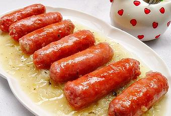 - Salchichas frescas de pollo y pavo. - 1 cebolla - 2 dientes de ajo. - Perejil. - Aceite de Oliva. - Vino blanco. - Sal y pimenta blanca.
