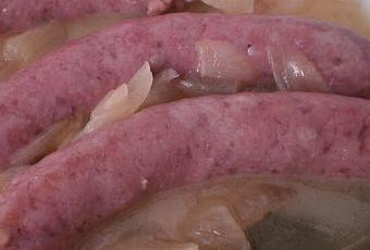 En una cacerola plana echar aceite de oliva virgen extra (estoy usando de Riogordo, malagueño, que por supuesto por la calidad de los aceites de nuestra provincia suelo aconsejar) de forma que cubra el fondo.Cortar una cebolla en trozos pequeños, alargados (como gusten) y dos o tres dientes de ajo en rodajasEcharlos en la cacerola, salar al gusto y pochar a fuego lento hasta que se ponga transparente, con cuidado de que no se quemen.Agregar las salchichas frescas y rehogar un minuto.Añadir un vaso de vino blanco (uso un fino Montilla-Moriles) y un vaso de caldo de puchero (en su defecto caldo de pollo), cuatro o cinco granos de pimienta negra y dos hojas de laurel.Dejar cocer durante quince minutos aproximadamente (depende del grosor de las salchichas) de forma que la salsa reduzca al gusto.