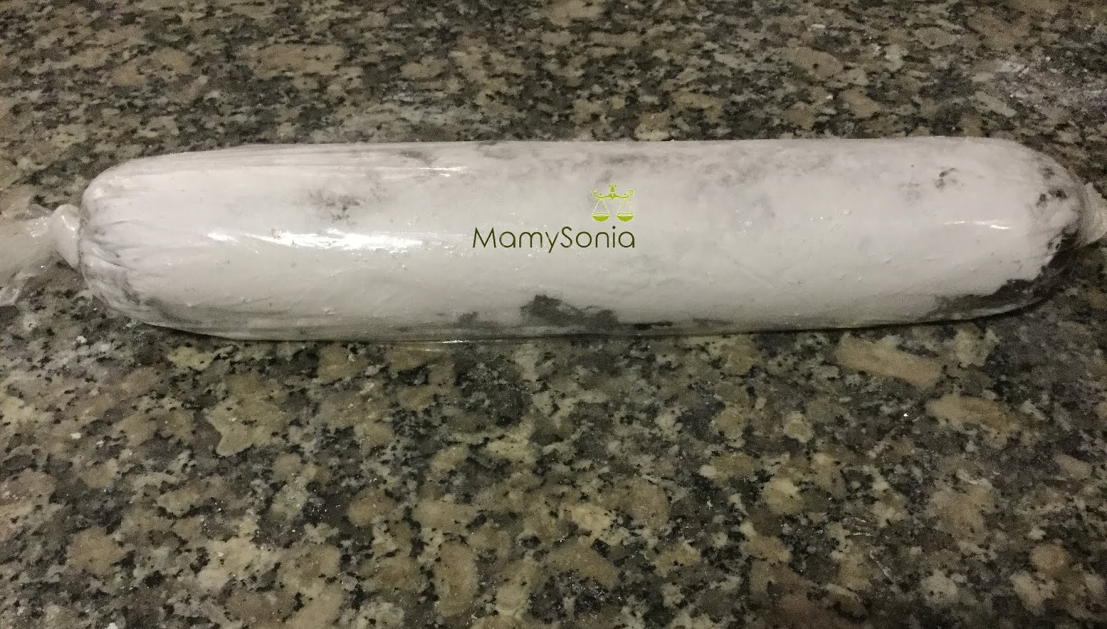 Cuando esté frío, espolvoreamos con azúcar glas y volvemos a envolverlo con el film transparente, apretamos con las manos para que el azúcar se pegue y haga el efecto de la piel de un salchichón.