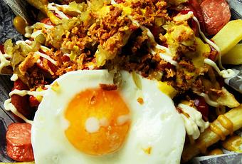 5. Servimos un puñado de patatas en un plato, por encima, unas salchichas, es hora de las salsas (opcionales) mostaza, kétchup, mayonesa, crema de ají, colocamos el huevo frito encima y terminamos con los pepinillos picados y la cebolla frita. A disfrutar!