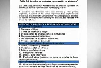 El empleo de actos públicos o simbólicos, la música y el teatro -elementos usados contra la isla- son medidas por las que apuesta Sharp en un manual que forma parte de las fuerzas militares en Estados Unidos, mencionó.