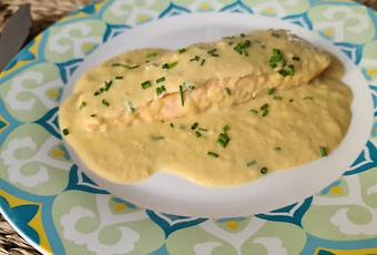 5. - Pasamos la salsa por la batidora, y la añadimos sobre el salmón cuando esté hecho, (aunque la próxima vez tal vez cuele la salsa para que no me queden los "grumitos" de la cebolla triturada). Y dejamos a fuego bajo 5 minutos todo junto.