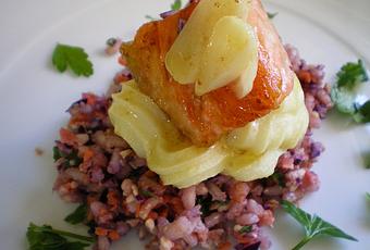 Para el emplatado, sencillamente ponemos una capa de ensalada de arroz, sobre ésta el rosetón de puré de patatas y coronamos con un taco de salmón al ajillo. Adornamos con los dientes de ajo laminados y fritos.