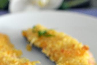 Colocamos los filetes de salmón fresco limpios de espinas en una bandeja apta para el horno. Salpimentamos al gusto. Cubrimos los filetes con una buena capa de la mezcla de parmesano y naranja.