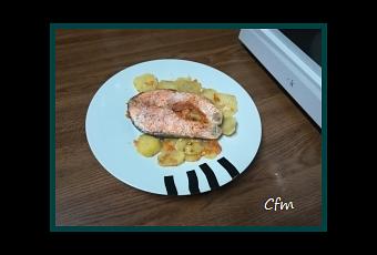 -Ponemos las patatas y la zanahoria troceadas en una fuente para horno, salpimentamos, ponemos un poco de ajo laminado y rociamos con un poco de aceite de oliva-Horneamos hasta que estén doradas hasta que se doren.-Pponemos la rodaja de salmón encima de una hoja de papel de aluminio, salpimentamos, le ponemos unas láminas de ajo encima y un par de rodajas de limón-Cerramos el papillote haciendo un paquetito sin ninguna abertura para que el pescado se cocine en su propio jugo y metemos al horno a 180 º durante 20 minutos-Emplatamos colocando el salmón sobre una cama de patatas y zanahoria