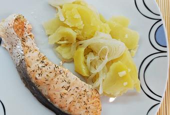 Cuando acabe, emplatamos el salmón junto a las patatas y la cebolleta y servimos recién hecho.