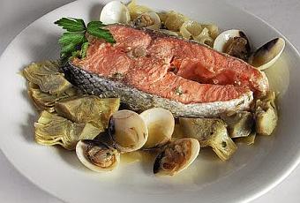 pasarse en el tiempo de cocción para que el salmón quede jugoso.Ingredientes para cuatro personas 4 rodajas de salmón Dos cebollas grandecitas 8 alcachofas 300 gr de almejas 250 cl de vino blanco 250 cl de caldo de pescado Un ramillete de perejil Dos dientes de ajo Un limón Aceite de oliva Sal Pimienta