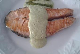 Ingredientes:Un kgr de salmón frescoun vaso de vino blancoun vaso de fumet de pescadoun manojo de espárragos triguerosun vaso de nata200 gr de mantequillasal