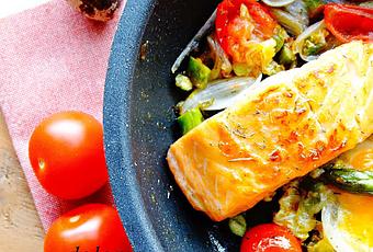 Poner a un lado de la sartén las verduras, en el espacio que queda libre colocar los trozos de salmón salpimentados, cocinarlos por un lado y darles la vuelta.