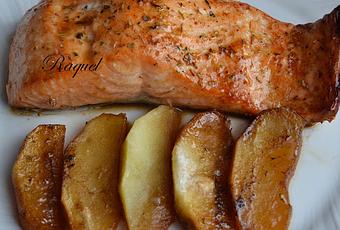 El resultado un salmón jugoso con un acompañamiento de manzana con el toque dulce del vino y muy melosas.
