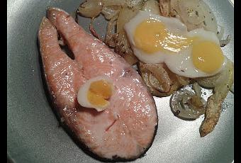 Se trata de salmón a la plancha. Recuerden no añadir aceite a la sartén o placha pues el salmón ya tiene suficiente. Lo tendremos unos 4-7 minutos por lado, dependiendo del grosor y sazonaremos al gusto. En nuestro caso, sólo sal. Por otro lado, doramos unos aros de cebolla y unas papas en rodajas con muy poco aceite. Si se quiere, éstas se pueden guisar primero y luego dorar. Sacar, poner sobre papel de cocina y salar. Por último, unos huevos de codorniz a la placha, una pizca de sal y un pelín de aceite. Así de sencillo tenemos un plato con un sabor delicioso. Antes, nos habremos tomado un buen plato de verduras o un puré, pues nunca deben faltar en nuestra alimentación.¡Besos y feliz fin de semana!