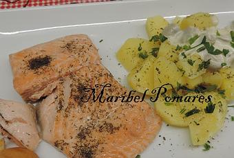 Ponemos en el plato de servir un lomo de salmón con unas patatas.