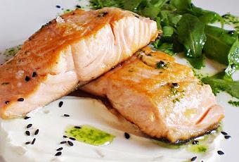 Poner un poco de esa mezcla en el plato, el salmón ya asado con flor de sal por encima y acompañar con rúcula . Repartir un poco de sésamo negro y unas gotas de aceite batido con unas hojas de perejil