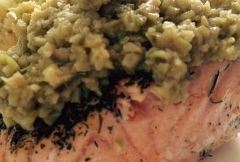 - Bajar la flama al mínimo y agregar el tapenade encima de cada filete, distribuyendo homogéneamente.