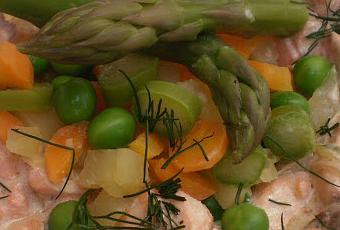 Pasos a seguir: Cortar el salmón en dados pequeños y reservar.Pelar los langostinos (quitándoles el instentino), reservarlos.Cortar en trozos pequeños una patata y una zanahoria. Media cebolla dulce en trozos alargados, un puerro (la parte blanca) en rodajas. Pelar dos espárragos, cortando en trocitos la parte blanda de los troncos y dejar las puntas enteras.Desgranar los chicharos (guisantes). Cocer la verdura por separado en agua con sal, la zanahoria y la patata por un lado; los espárragos y por último en el mismo agua agregar los guisantes, procurando que queden al dente. Mientras en una sartén echar la mantequilla y una vez derretida, a fuego lento pochar la cebolla y el puerro, salando previamente, durante unos minutos.Añadir el salmón y los langostinos, darles unas vueltas, durante un minuto, procurando que se sellen los trozos de salmón por todas partes. Añadir enseguida el vino blanco y dejar evaporar, agregando a continuación la nata. Una vez que llegue a ebullición apartar del fuego. Emplatar colocando en el centro del plato la verdura y colocar el eneldo picado por encima.