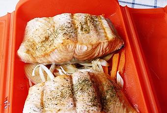 Pelar y cortar la verdura en bastones, colocarlas en el fondo del estuche, salpimentar. Colocar por encima los lomos de salmón (podéis utilizar sin problemas rodajas).