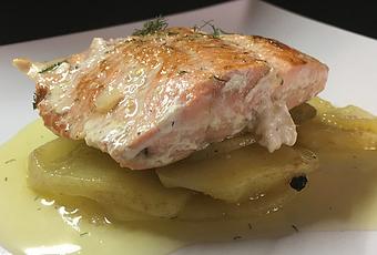 Para emplatar: pondremos una cama de papas y sobre ellas el salmón confitado que regaremos con la mantequilla del confitado