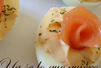 Cocemos los huevos durante 10 minutos ( los ponemos con el agua fría y contamos el tiempo desde que empieza a hervir) no más para que la yema no se nos ponga verde. Enfriamos los huevos duros bajo el grifo y pelamos. Cortamos cada huevo por la mitad y le sacamos las yemas, reservamos. Con las lonchas de salmón ahumado hacemos pequeñas tiras ( saca 16) que enrollaremos convirtiendo en pequeñas rositas que reservamos también, usando los recortes sobrantes de las lonchitas para el relleno. En un recipiente ponemos la mayonesa, la soja, las yemas de los huevos, los restos de haber cortado el salmón y los palitos de cangrejo troceados. Trituramos hasta tener una crema untuosa que colocaremos en la manga pastelera y reservaremos en la nevera mientras cortamos una pequeña lámina en la base de cada mitad de huevo para que al colocarlos en la bandeja no nos bailen. Los rellenamos entonces con la crema reservada en la manga, los espolvoreamos con el eneldo y los colocamos en una bandeja rematando cada huevo con una rosita de salmón.