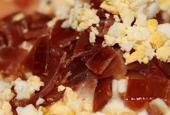 Servirlo en un bol y añadirle huevo cocido picado y jamón serrano.